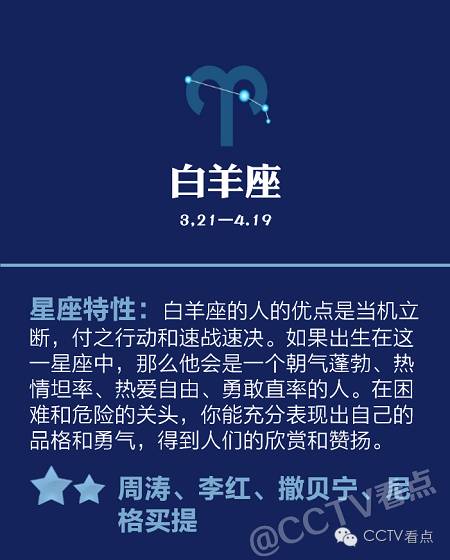 白羊座极具勇气,从不服输,而且喜欢探索和斗争,他们能够当机立断,而且行动特快,特别能会跑新闻!(撒贝宁跑到综艺界了!)