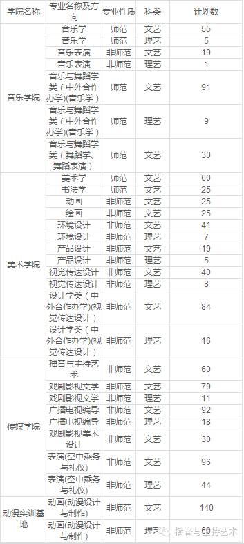2016年我校音乐学、音乐与舞蹈学类(中外合作办学)(音乐学)、音乐表演、音乐与舞蹈学类(舞蹈学、舞蹈表演)、美术学、书法学、视觉传达设计、设计学类(中外合作办学)(视觉传达设计)、环境设计、产品设计、动画、绘画、戏剧影视美术设计、动画(动漫设计与制作)、播音与主持艺术、广播电视编导、戏剧影视文学、表演(空中乘务与礼仪)等本科专业招收艺术类考生。